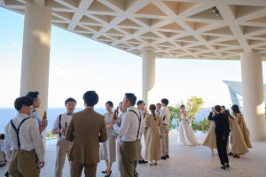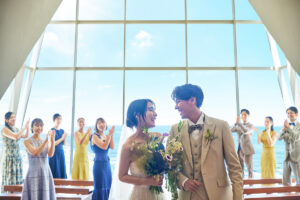 玻璃祭壇映照出大海鮮明的藍色漸層,為新人迎來了來自大自然的祝福。