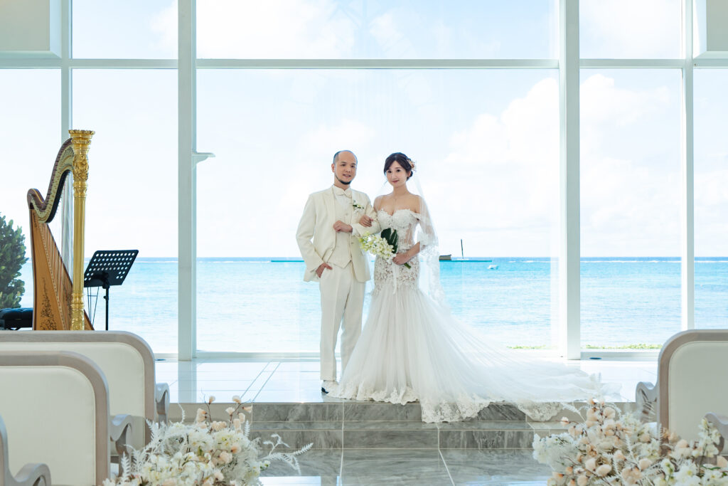 從籌備到出發前,我最擔心的就是天氣。11月的沖繩,偶爾會有突如其來的陣雨,但婚禮當天卻是一整片晴朗的藍天。當陽光穿過教堂玻璃映照在白色禮服上,那一刻,我只覺得一切的不安都值得。儀式結束後,我們換上輕盈的婚紗走到沙灘上,海風帶著鹹味與花香,彼此相視的微笑,就是我們心裡最真的幸福模樣。