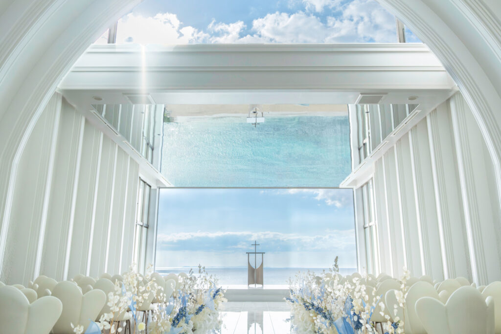 長輩最常見的誤解之一,是認為海外婚禮過於隨興,缺乏傳統婚宴的正式感。這時,視覺的說服力往往勝過千言萬語。以位於沖繩的「希艾爾教堂」為例,其宏偉的建築與挑高、具備極強音律感的空間,展現出的氣勢氛圍絕不亞於國內五星級飯店。在牧師的見證下,交換戒指與誓詞的儀式是極其神聖且充滿家族傳承意義的。透過具體的建築美學與現場氛圍的描述,能有效消除長輩對海外婚禮「只是去玩」的偏見,讓他們感受到這是一場嚴謹、正式且值得被尊重的生命典禮。