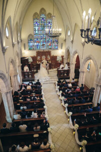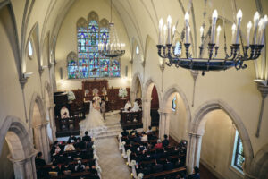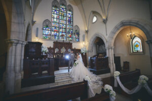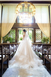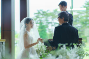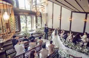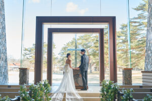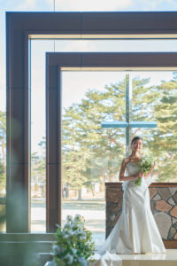 教堂前面是大幅落地玻璃,祭壇後方與天花板逐漸升高,讓自然光線像瀑布一樣傾瀉進來,輕井澤的樹林、空氣與光影直接成為背景。 整體氛圍清新、現代、療癒,適合喜歡北歐簡約風或森林系的新人。