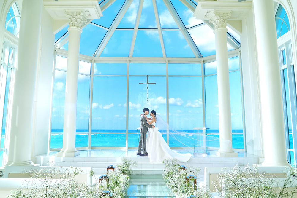 座落於 Hotel Nikko Alivila 渡假村內的克莉絲蒂教堂,以其純潔的白色石材與藍色天空交織出如史詩般的畫面。當新人步入這座充滿光影層次的殿堂,空間中流動的空氣似乎都帶有海島特有的純粹。隨著儀式落幕,這份餘韻優雅地延伸至充滿貴族氣息的宴會空間。透過大片落地窗,沖繩那抹層次分明的藍海成為了最珍貴的背景。這份空間的從容感,讓賓客能從觀禮時的悸動,自然地切換至一種沈浸式的渡假狀態,在輕盈的氛圍中,開啟一場關於感謝與分享的歡聚時刻。