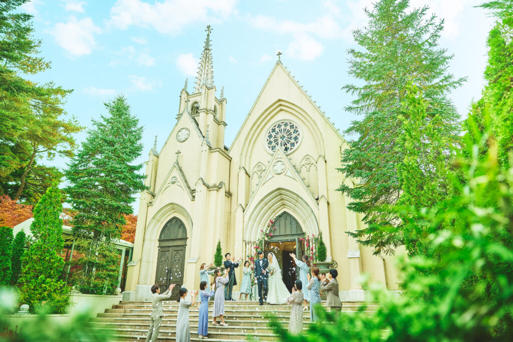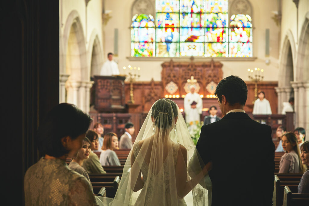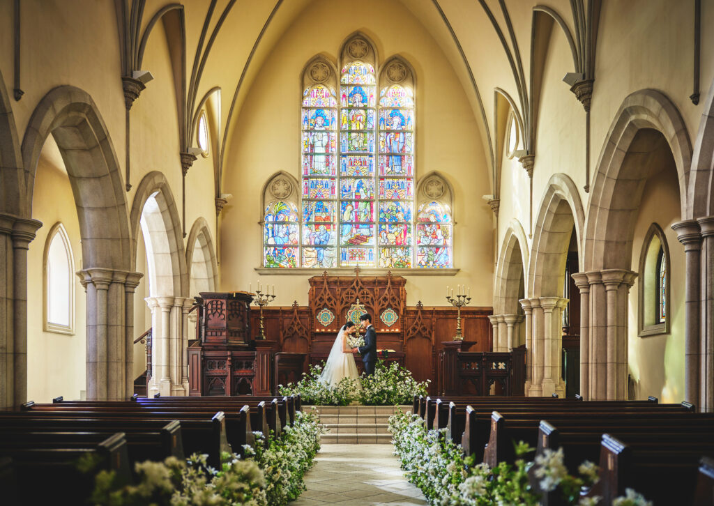 溫暖的彩繪玻璃光影與親友的祝福,共同為新人締造神聖而感動的瞬間。
