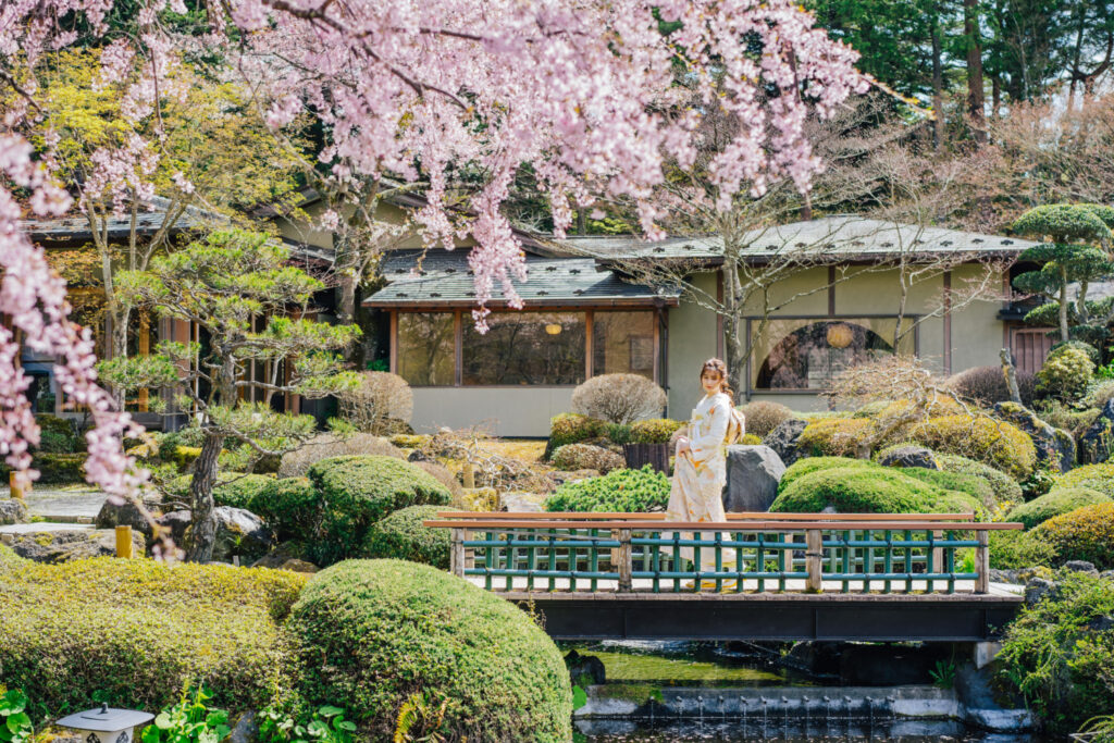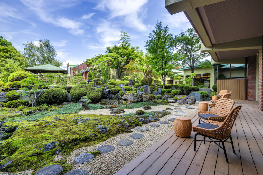 春季時櫻花絢爛盛開,夏季可遠眺碧綠深林與潺潺清流,秋季庭園鋪滿色彩繽紛的紅葉,如同彩繪的絨毯,冬季則化身銀白靜謐的雪景世界。